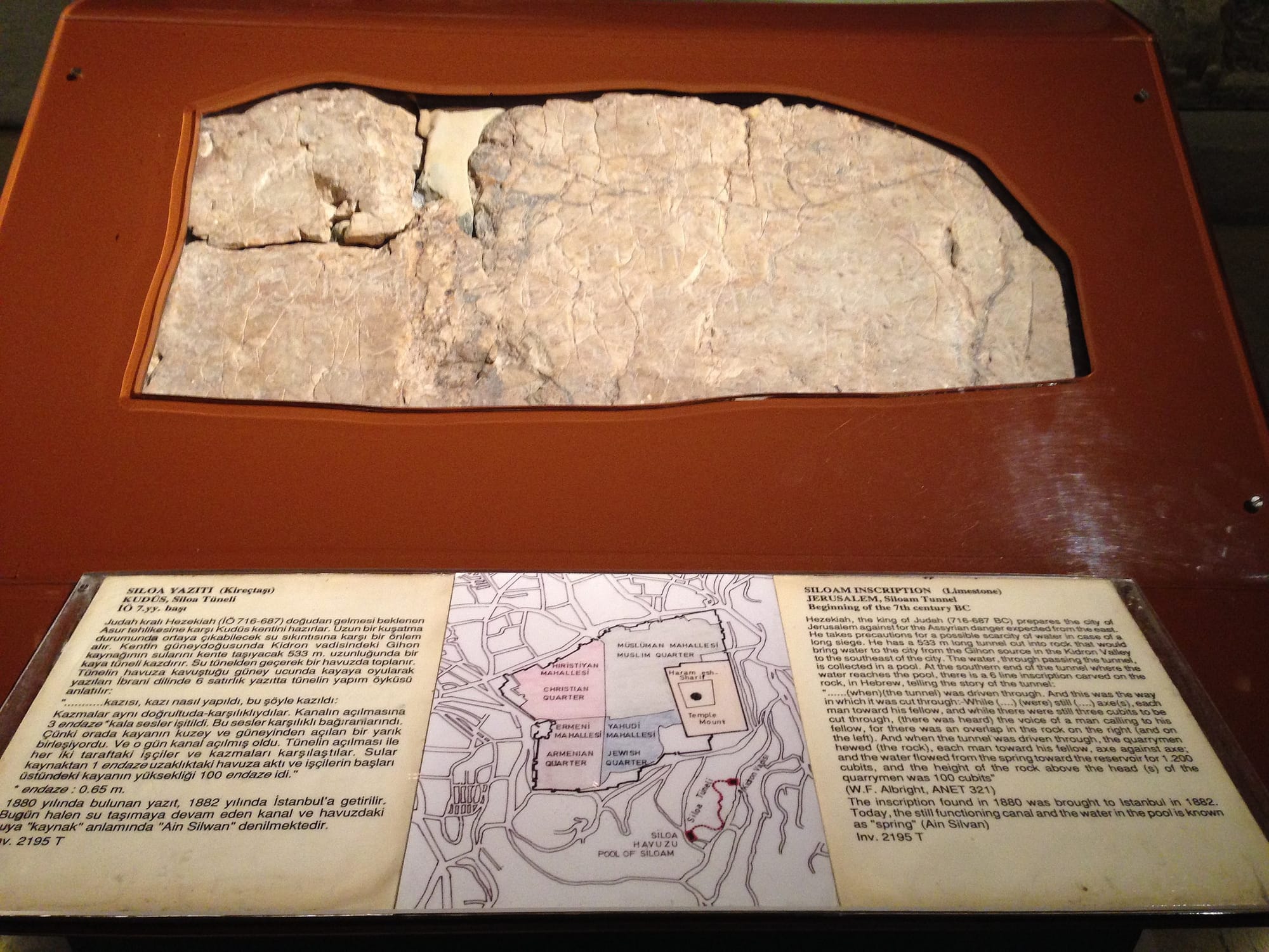 Lebih menakjubkan lagi, pada tahun 1880, sebuah prasasti Ibrani kuno ditemukan di dinding terowongan yang mencatat momen dramatis ketika dua tim penggali yang bekerja dari dua arah berlawanan akhirnya bertemu di tengah. Prasasti ini ditulis dalam aksara Ibrani kuno yang khas dari akhir abad ke-8 SM, yang sesuai dengan masa pemerintahan Raja Hizkia.